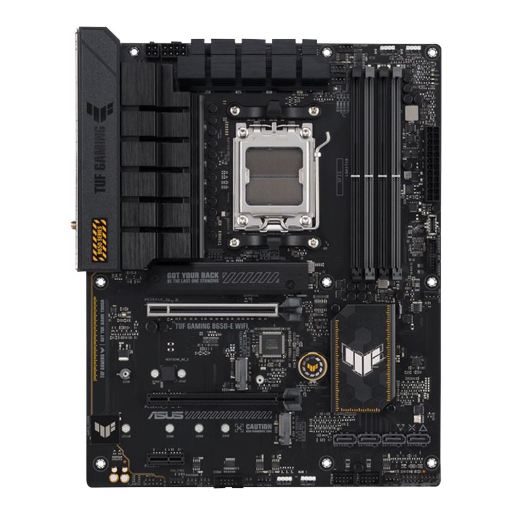 ASUS TUF GAMING B650-E WIFI takes all the essential elements of the latest AM5 Socket for AMD Ryzen Desktop Processors and combines them with game-ready features and proven durability. Engineered with military-grade components, an upgraded power solution and a comprehensive cooling system, this motherboard goes beyond expectations with rock-solid and stable performance for marathon gaming. TUF GAMING motherboards also undergo rigorous endurance testing to ensure that they can handle conditions where others may fail. Aesthetically, this model incorporates rugged off-black and geometric design elements to reflect the dependability and stability that defines the TUF GAMING series.
