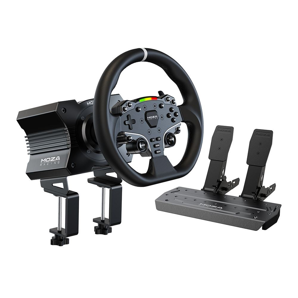 MOZA R5 All-in-One PC Gaming Racing Simulator 3PCS Bundle: 5.5Nm Direct Drive Wheel Base, 11-inch Racing Wheel, Anti-Slip Pedals and a Desk Clamp, Cloud-based App Control
